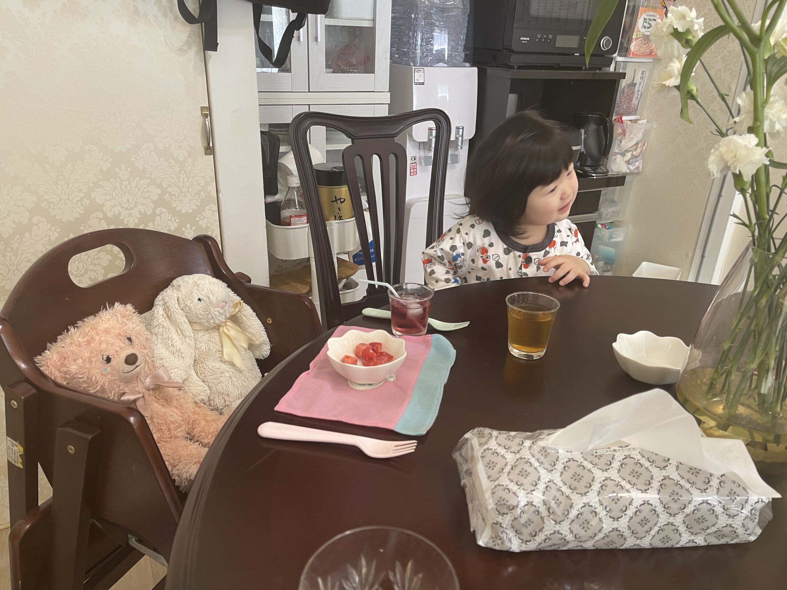 ウサギさんを忘れているのでママが連れてくるとウサギさんにもご飯を食べさせていました。