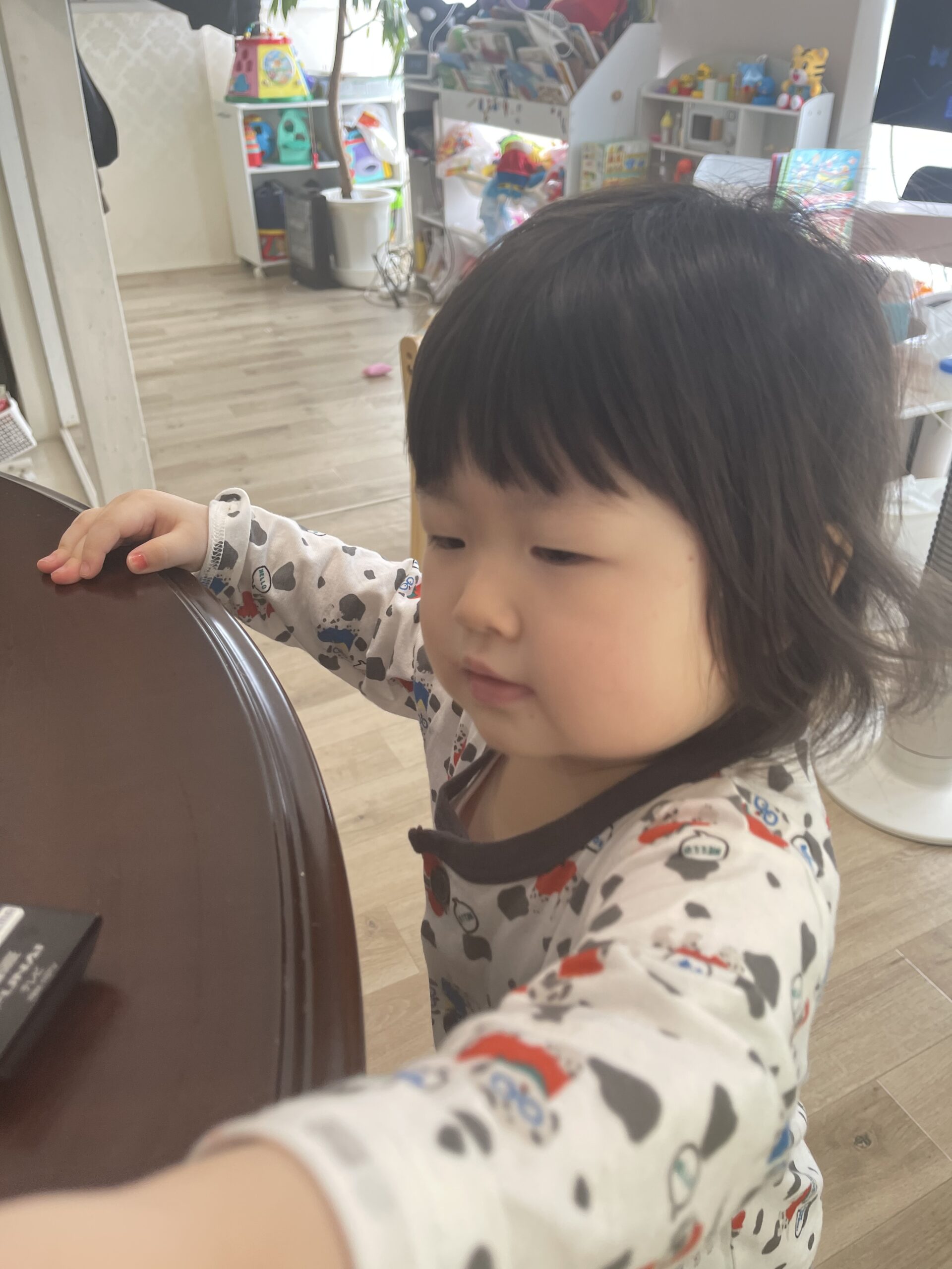 ママと朝から遊び、朝からママがテーブルに座っていると隣に来て