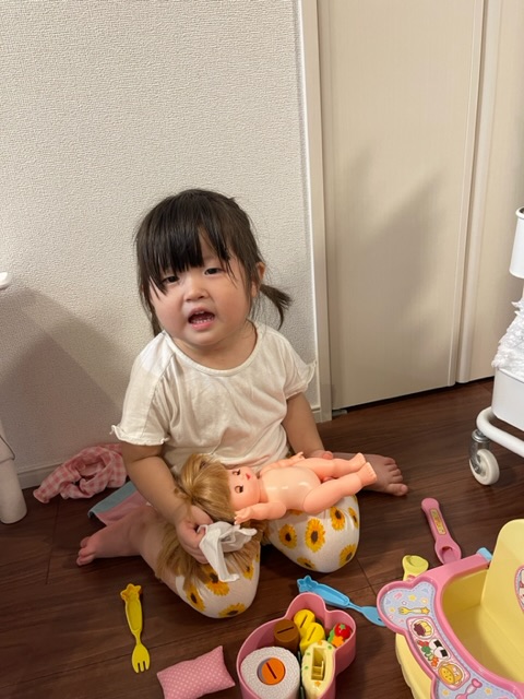 積み木をポテトに見立てて食べてTシャツの中に入れて最後にうんち出だしで遊んだりしました!